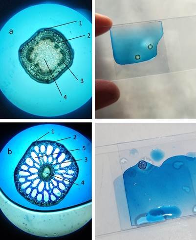 Figura 1 – Comparação das formas emersa (a) e imersa (b) da Hygrophila corymbosa (Blume) Lindau em vista de seção axial. 1- derme; 2- parênquima; 3- floema; 4- xilema e 5- aerênquimas. Fotos a e b em 400x.