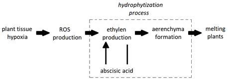 Nos meus estudos sobre os ROS nesse contexto, descobri que são produzidos também em condições de hipóxia, quando a presença do oxigênio é muito escassa, e essa situação é típica das plantas que precisam se adaptar ao encharcamento do terreno ou cheias de rios. O que acontece é basicamente o seguinte: quando as plantas na forma emersa são inundadas, o sufocamento das raízes produz muitos radicais livres que, por sua vez, ativará a produção de etileno. O etileno é importante nesse contexto porque é ele efetivamente quem sinaliza para a planta que é hora de começar a transformação. A necessidade mais urgente e crítica para as plantas nesse processo é o oxigênio até para garantir a alta demanda energética para sustentar todas essas transformações. A formação dos aerênquimas é transformação mais urgente e é iniciada dentro de algumas horas.